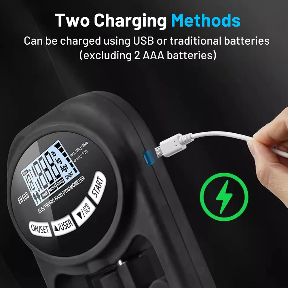 4. Screen display and USB charging: The newly improved screen function of the grip strength tester allows you to clearly see the readings even in dark environments. It can be charged with a USB cable, which is more environmentally friendly. You can also use standard AAA batteries (not included).