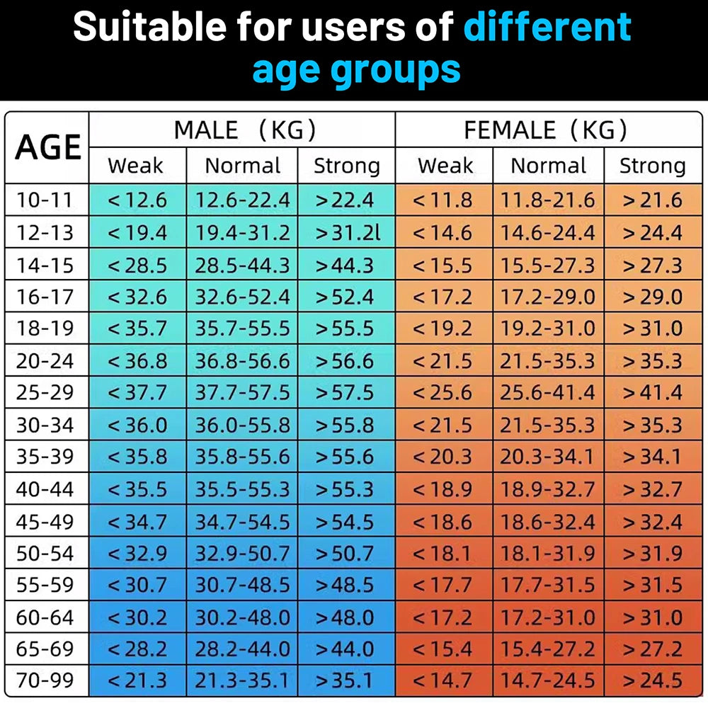 3. [Easy to use] The large LCD screen of the grip gauge displays all measured values on the same screen. The displayed readings include user code, age, gender, grip strength values in pounds or kilograms, and grip strength status. The maximum grip value display and power level are low, normal or can be stored and easily retrieved for comparison.